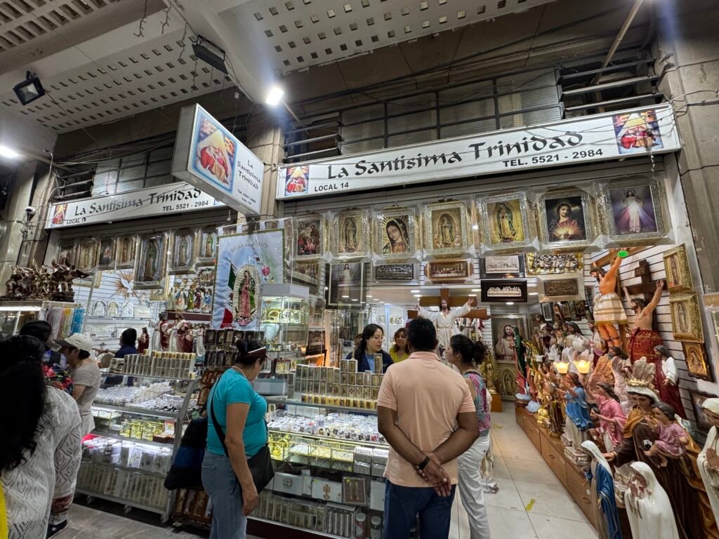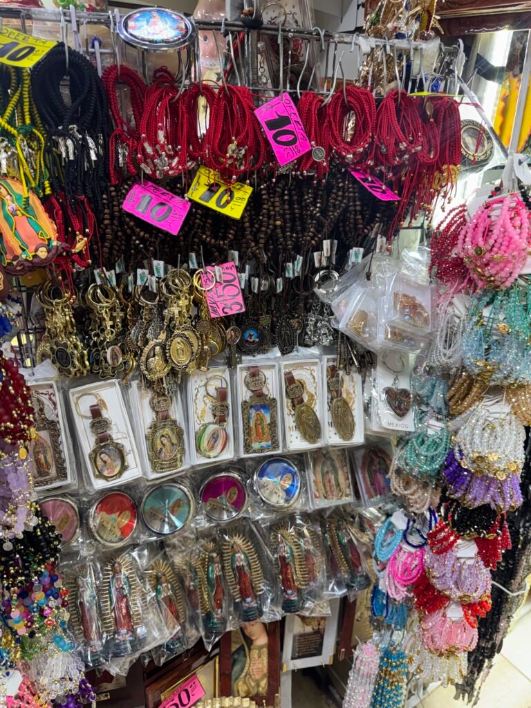 Muchos turistas terminan pasando horas recorriendo estos puestos, no solo por los precios, sino por la experiencia visual y cultural que representa caminar entre colores, música, aromas de incienso y expresiones de fe popular mexicana.